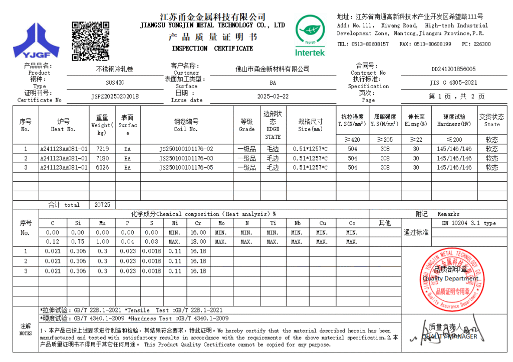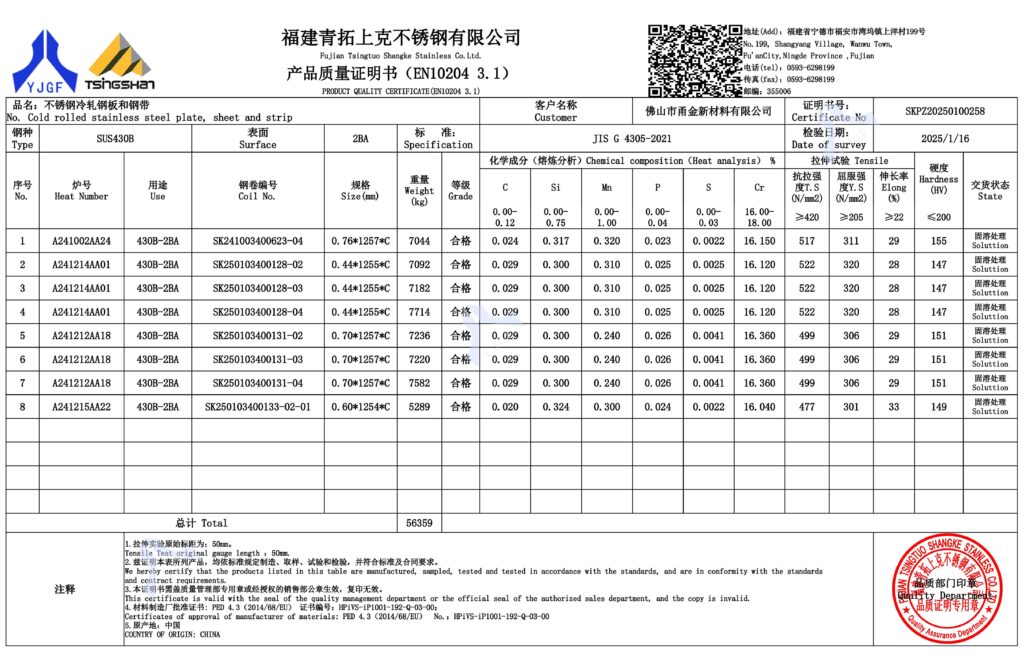 | 430BA1 | 双冷轧处理,具有优越的表面质量和亮度 | 高端装饰性修边条(汽车和钢琴行业) |