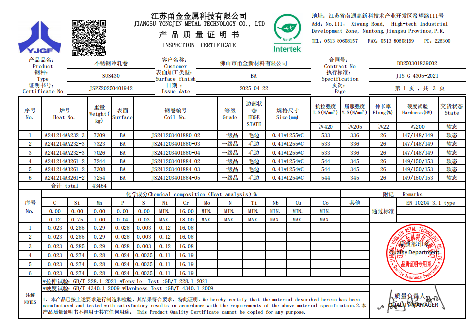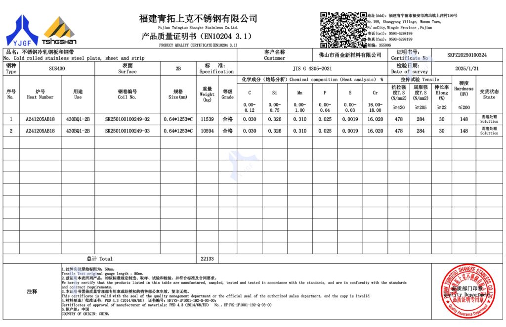 | 430/2B | 表面均匀性和可成形性 | 拉伸成形和表面油磨应用 |